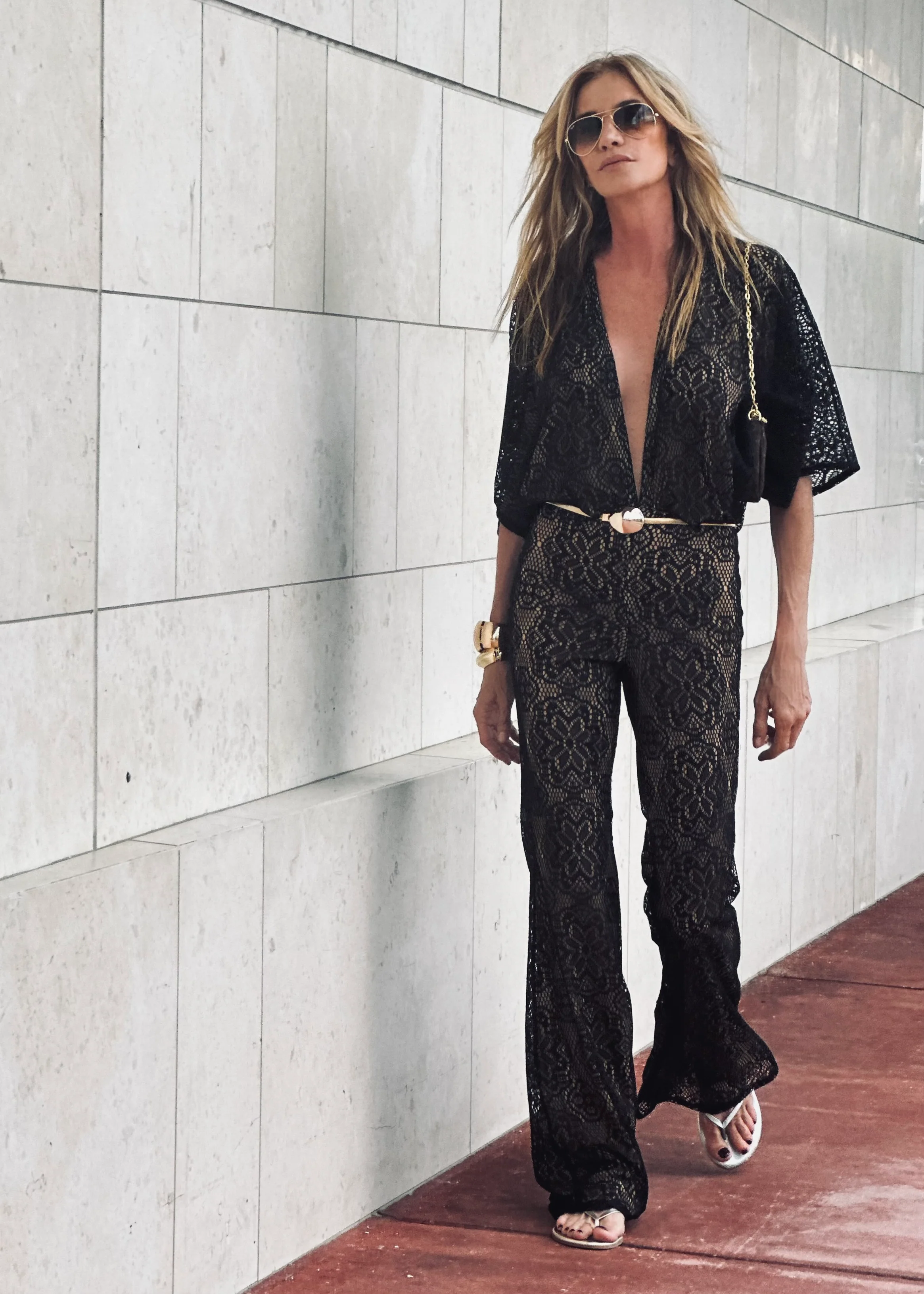 Elevate your evening wardrobe with this effortlessly glamorous black lace jumpsuit. Designed to make a statement, it features a deep V-neckline and relaxed kimono-style sleeves that drape beautifully over the shoulders. The intricate lace pattern adds texture and sophistication, while the fitted waist and dramatic flared legs create a striking, elongated silhouette.