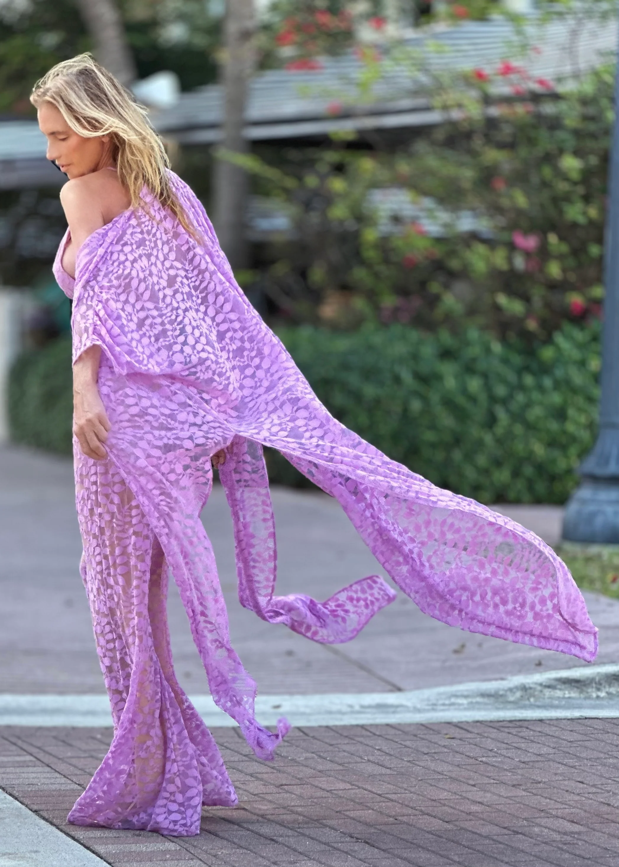 The Erte Kaftan Lilac Lace offers versatile elegance for your wardrobe. Whether styled as a tied shirt, a stylish swimsuit cover-up, or layered over dresses, shorts, or pants, this kaftan brings a refined and luxurious accent to any ensemble.