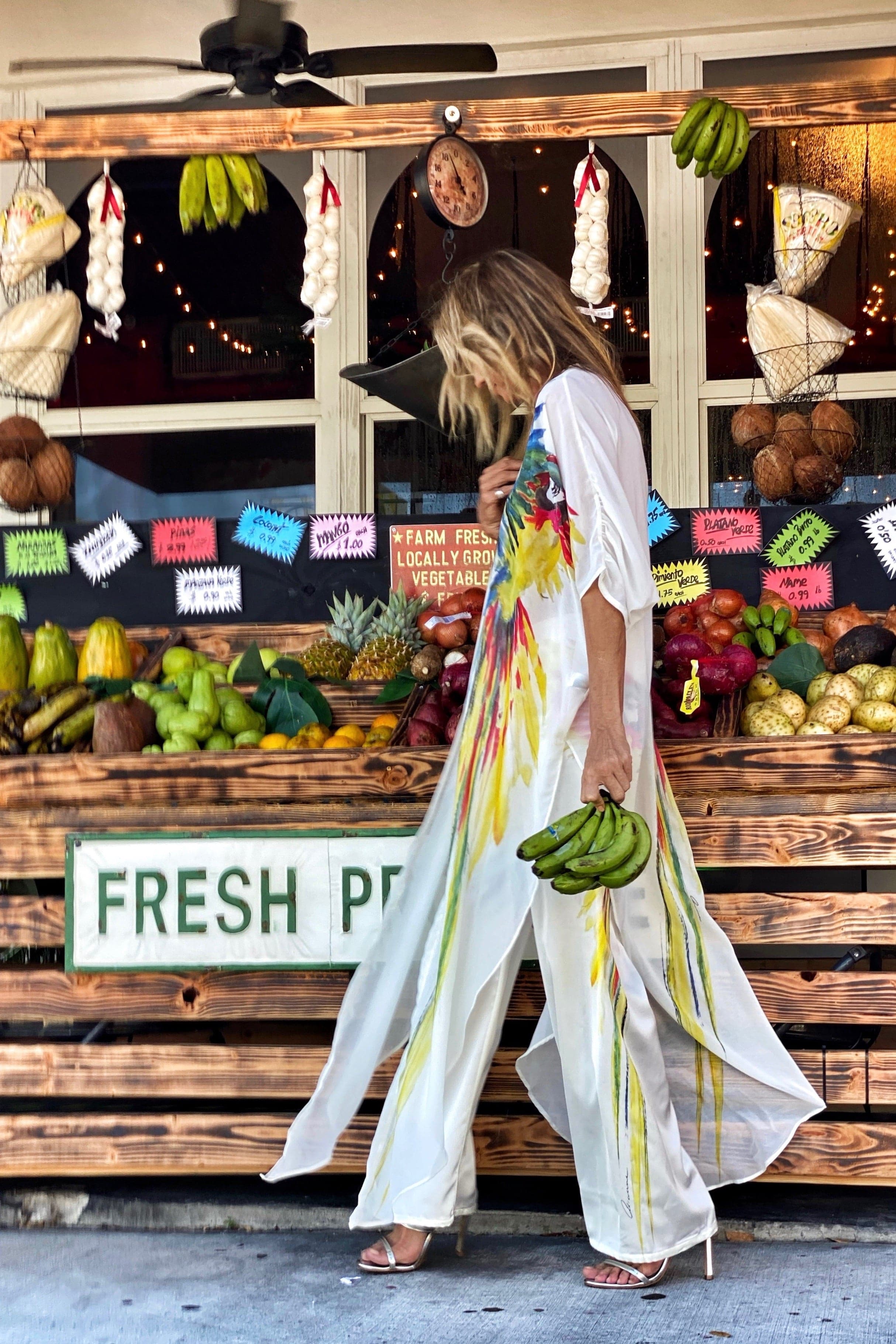 Enhance your wardrobe with our Erte Kaftan Parrot. This versatile piece can be effortlessly styled over your bikini, dress, shorts, or pants, tied in the front for a chic and sophisticated look.