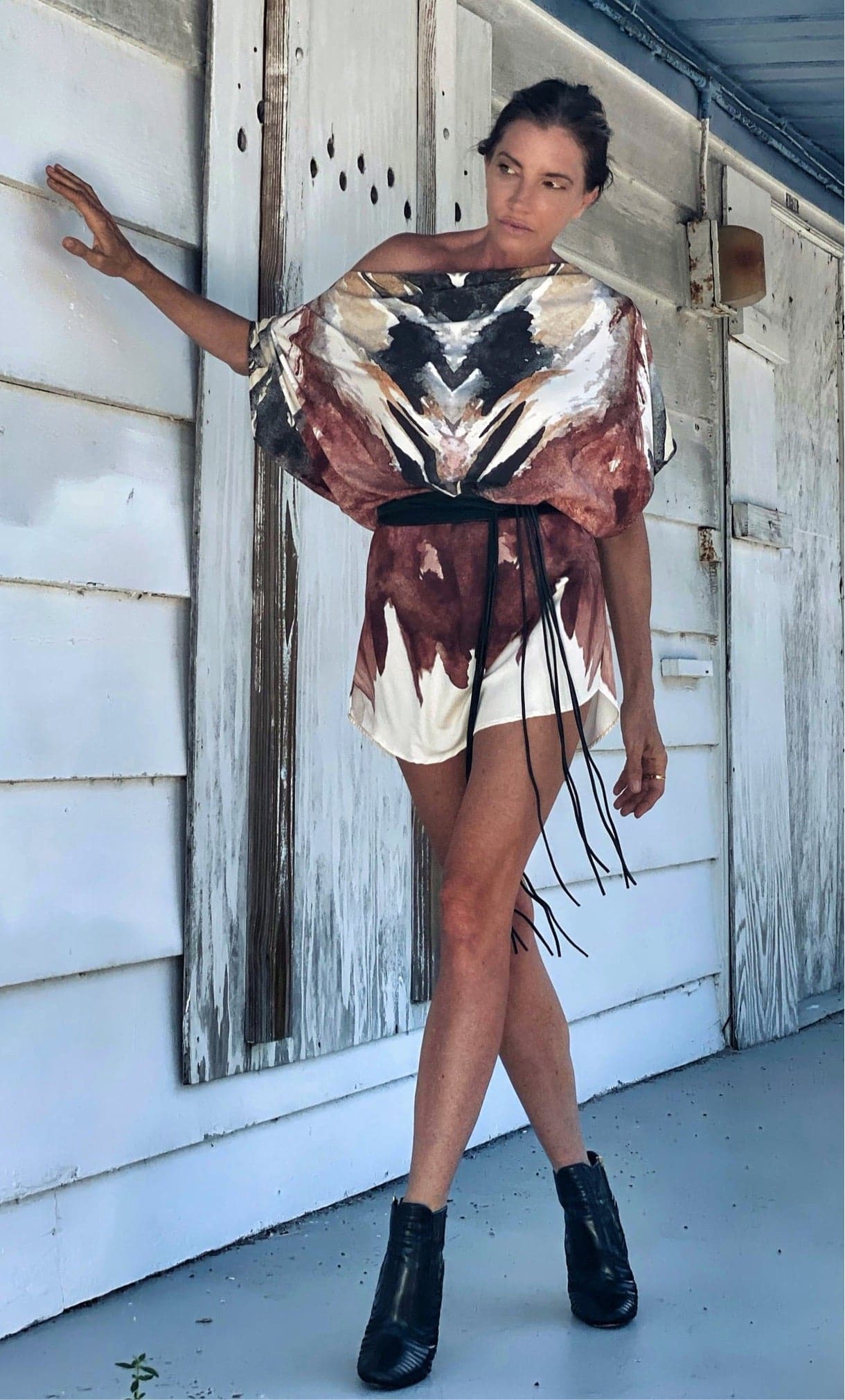 The Gita dress is a Ramona La Rue classic brought back from the archives. This is a perfect throw on and go dress. A casual chic wardrobe must as a dress or paired with jeans. Owl Feather is always sexy on. Arianne, suggest wearing with the Lion Belt (sold separately) to create the blousant look seen in the images.