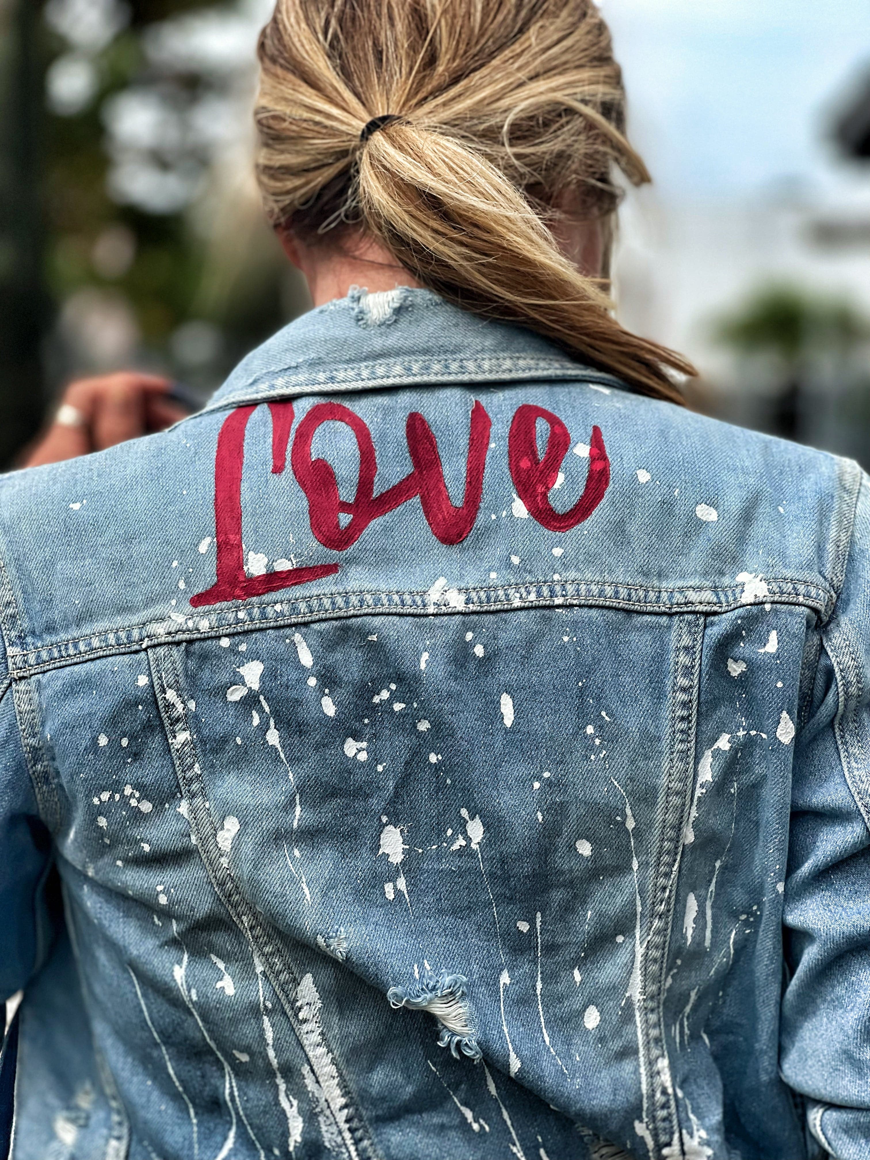 Our Love denim jean jacket is a hand-painted work of art that takes 3 business days to complete. This form-fitted jacket is crafted with care and love by the designer's own hand. Its unique distressing and cropped design make it a perfect choice for any day of the year. Layer it with a tank top or short sleeve for an extra cool and stylish look. With amazing features, this jacket is a timeless piece of fashion that embodies the essence of love.