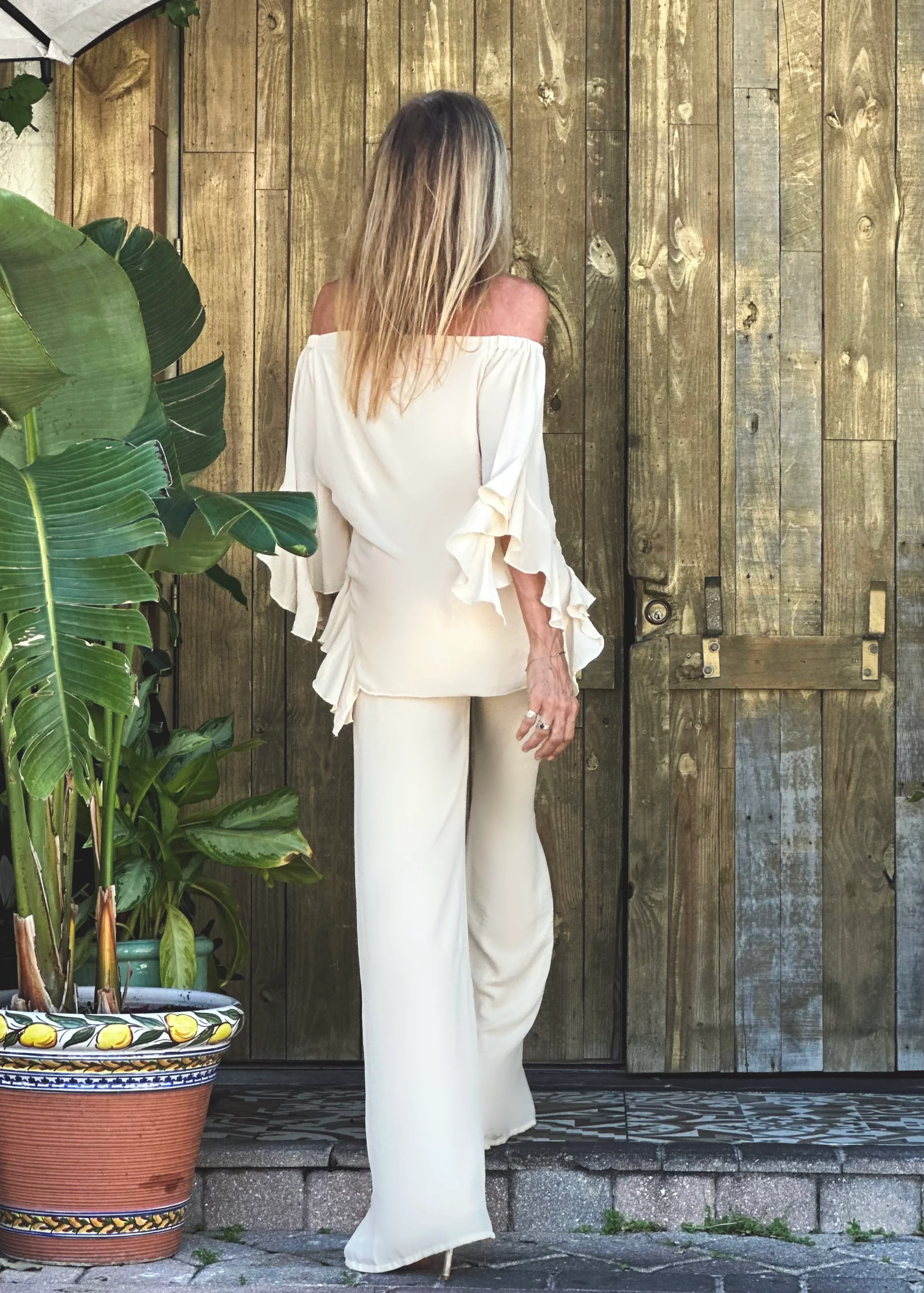 Discover the trendiness of the Lucy Top, with its off-the-shoulder silhouette, ruffled sleeves, and hem. The breezy contrast between the double-lined body and single lined sleeves adds an irresistible touch. For a complete look, pair it with the Lucy Pants.